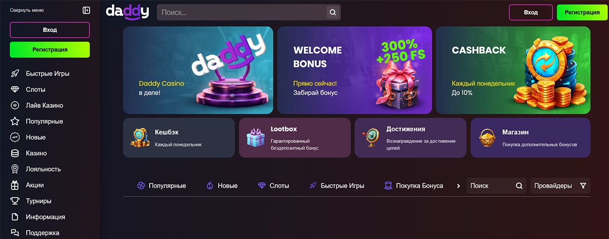 Основные особенности официального сайта Daddy Casino